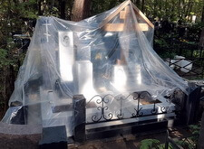 К сожалению, в самый разгар работы нас застал дождь. Так как реставрация требовала сухой погоды, то мы закрыли место захоронения плёнкой и покинули кладбище, отложив восстановление на несколько суток.