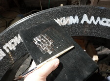Переходим к надписи. Текс будет размещён на лицевой стороне надгробья, под гравировкой сидящего человека. Метод гравировки ничем не отличается от текста в ранее изготовленной книге: пескоструим и грунтуем надпись, после чего покрываем клеем, на который накладываем сусальное серебро. Буквы зачищаем и избавляем от лишних образований. Получившийся результат сверху покрываем лаком.